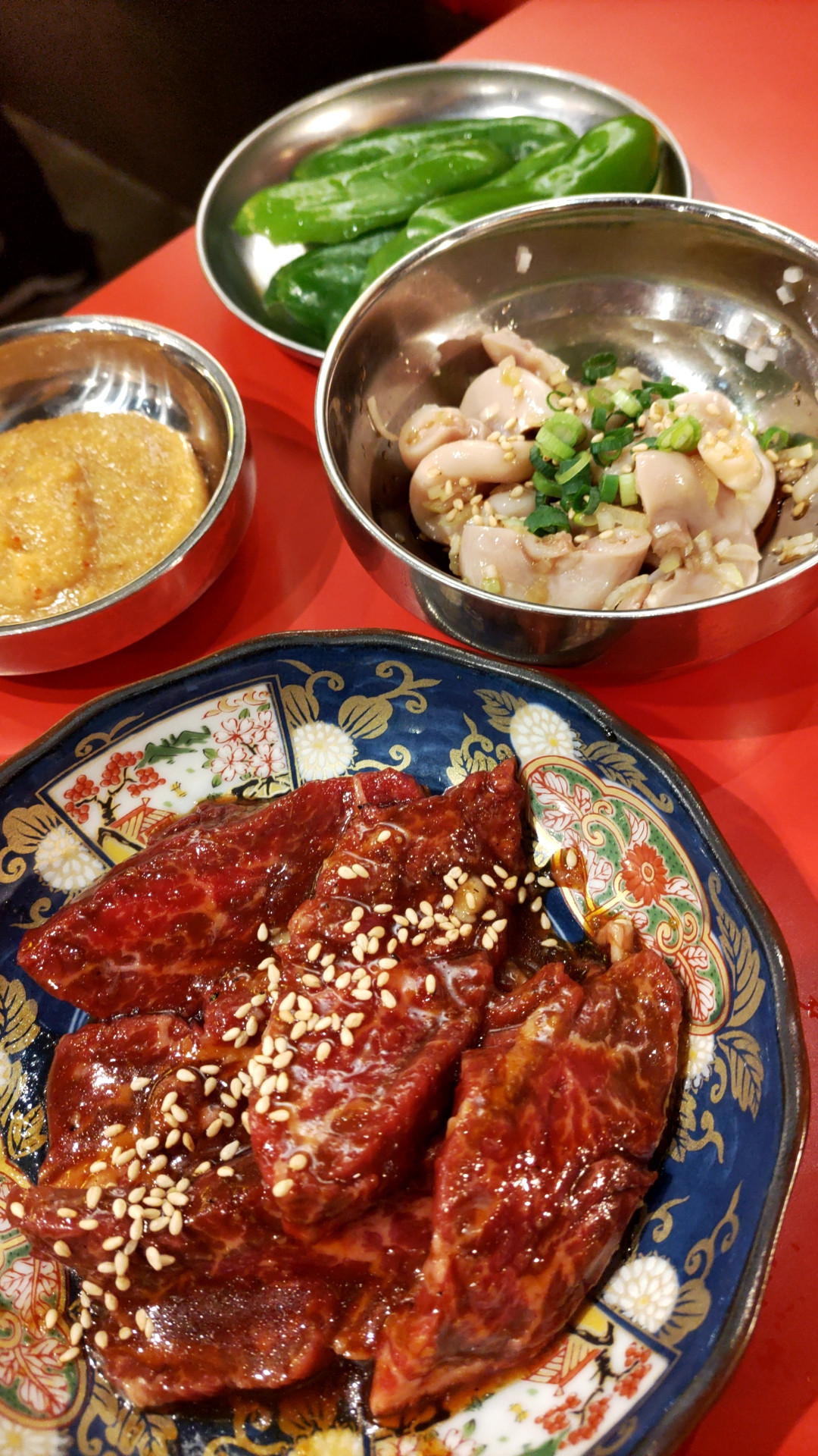 味噌ピーマン、コブクロ刺し、ハラミ