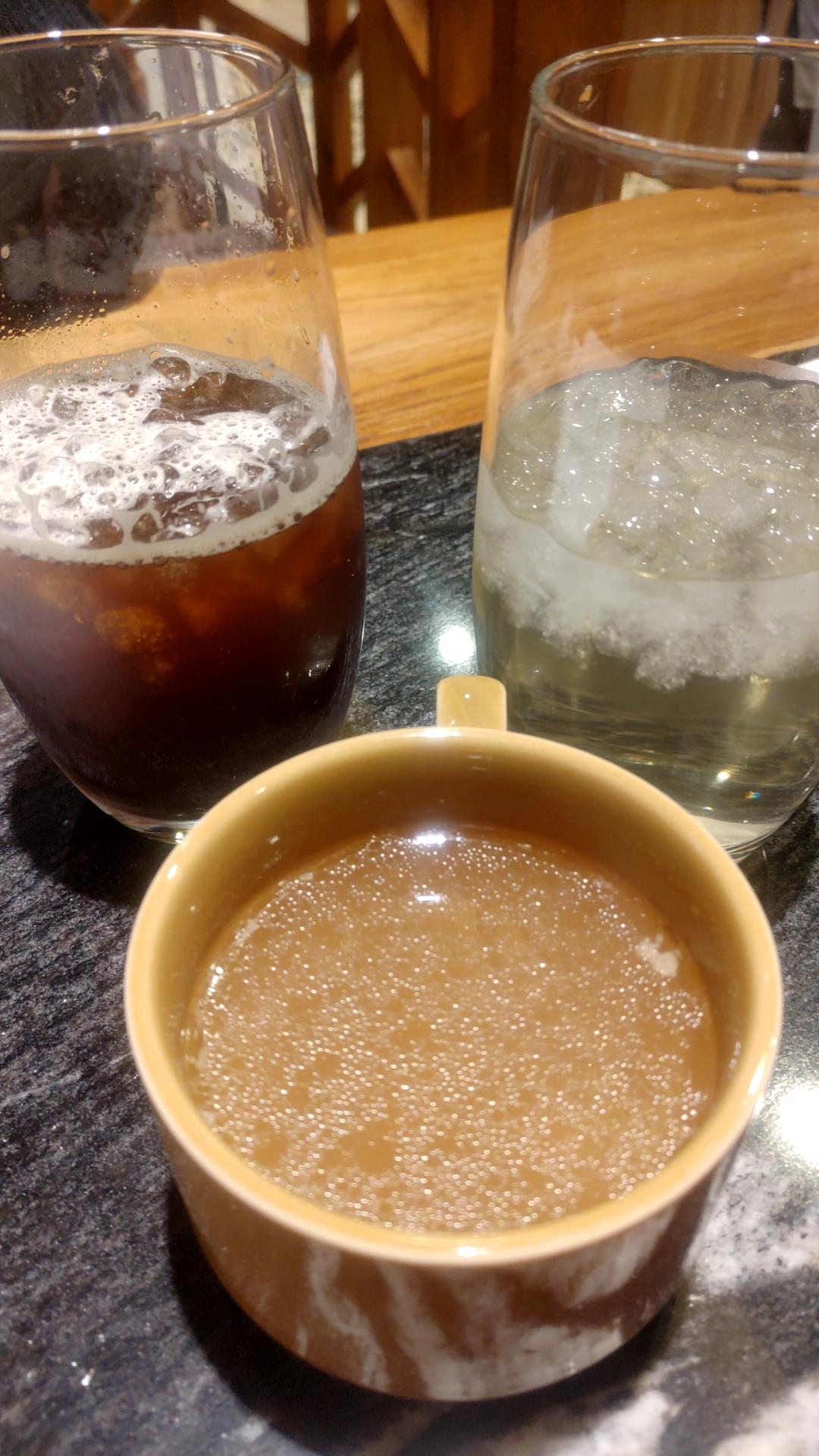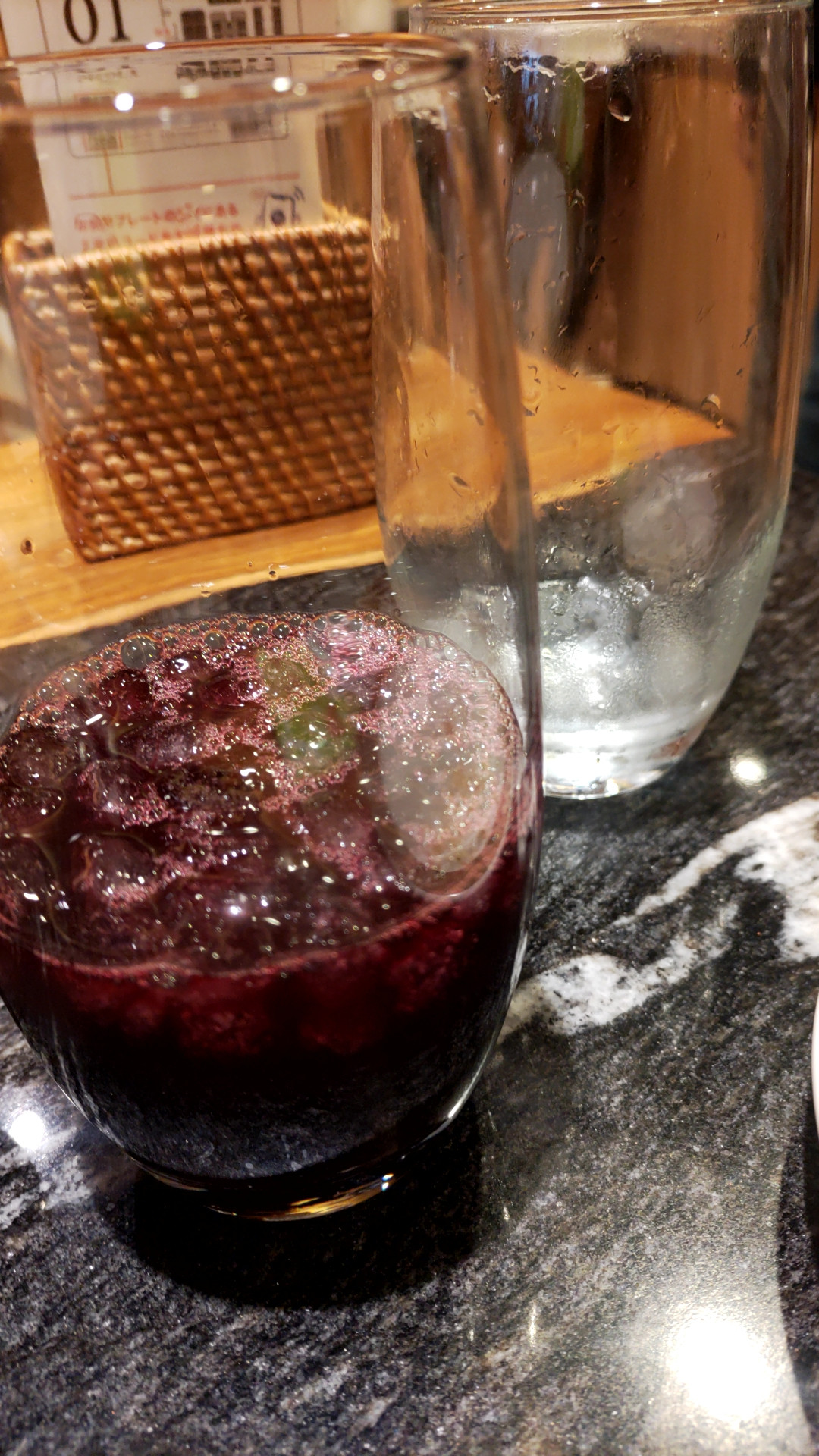 飲み放題のソフトドリンク、アイスコーヒーとシャルドネ。